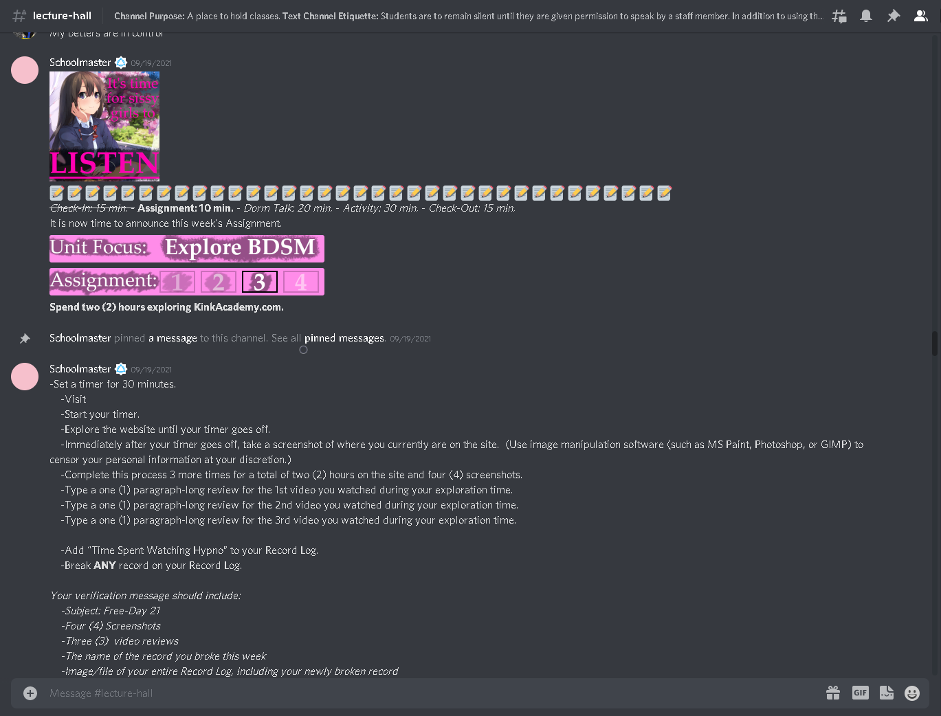 In addition to the Sissy Drills series (which is free and available on Hypnotube.com), the Academy offers a large archive of curated links, guides, lessons, tasks, and knowledge to aid in your transformation. Custom-made, automated domination bots ensure you will commit to your path and grow beyond your limits.